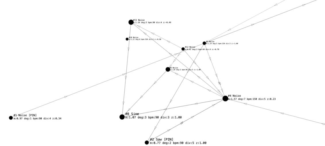 This nodal synth project is based on a false memory. I was discussing false memories with friends last night and reflecting on some of my own. I woke up the next day still thinking about this. I often think about something that my friend Ben had shown me years ago, I have this strong memory of connected objects like a circuit diagram or a mechanical network, and of it running like a program and making sound, and I have a distinct image of it which I am pleased to say I have recreated here. At the time Ben was studying music and physics, maybe 1998ish. I had no idea what coding was at the time, but I understood mechanical systems and